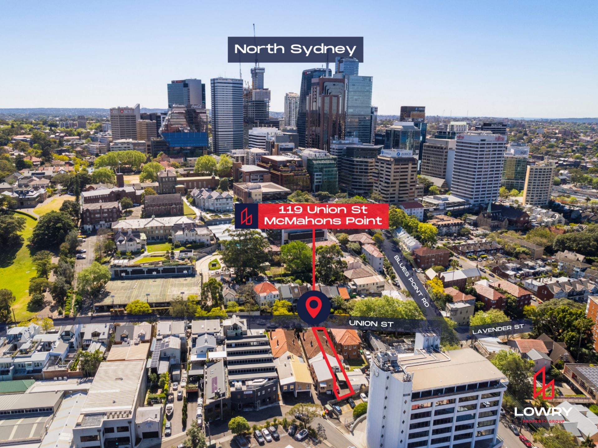Lowry Property Group and Northside Realtors are pleased to present 119 Union Street, McMahons Point. This property consists of a charming semi-detached cottage currently configured as a commercial office with a rear residence. Offering exceptional flexibility, the property sits on a generous 297 sqm landholding with rear lane access and parking for four cars.